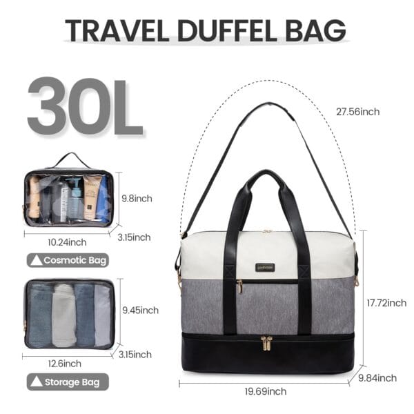 Esta es una de las piezas más completas de nuestra selección curada: un bolso de viaje mujer fabricado en PU de alta calidad, resistente al agua y al uso constante, con una superficie de tacto suave y firme que mantiene la estructura incluso cuando va cargado. Su peso de apenas 1,5 kg lo hace cómodo de transportar durante horas sin que el cuerpo lo sienta. Con 60 x 50 x 40 cm ofrece una capacidad real y generosa que se organiza sola gracias a su compartimento organizador interno, ese diferencial que permite separar calzado, prendas húmedas o artículos personales del resto sin mezclas ni desorden. Disponible en tres combinaciones de color pensadas para combinar sin esfuerzo: beige con gris y negro para un look neutro y sofisticado, beige con negro y camel para una paleta cálida con personalidad, y gris con negro y camel para las que prefieren tonos urbanos con profundidad.